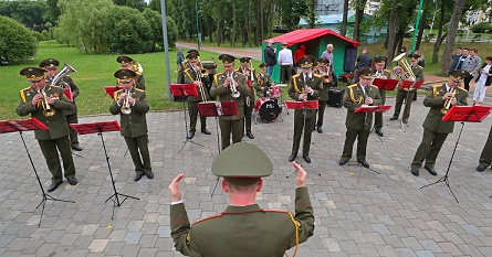 7月3日,軍樂隊在白俄羅斯首都明斯克街頭演奏樂曲。