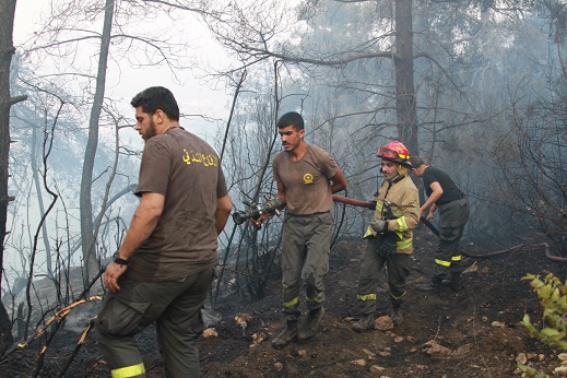 7月29日,黎巴嫩民防人員在阿卡爾省火災現(xiàn)場滅火。