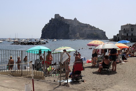 7月29日,人們在意大利那不勒斯伊斯基亞島的沙灘上休閑。
