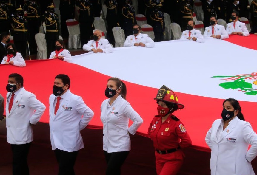 7月30日,在秘魯首都利馬陸軍總部,參加過抗疫的醫(yī)務(wù)人員和軍人舉著秘魯國(guó)旗參加閱兵式。