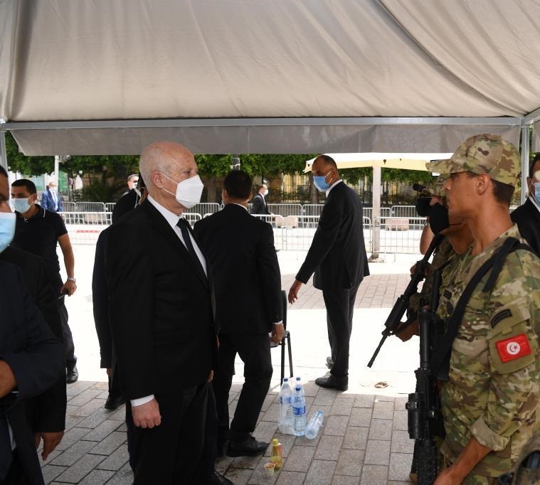 8月1日,突尼斯總統(tǒng)賽義德在首都突尼斯市中心與街頭維護治安的士兵交談。