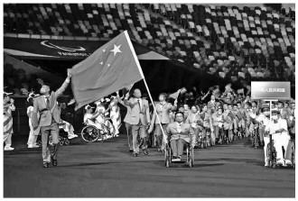 擔任中國代表團旗手的男子田徑運動員王浩天生右小臂殘疾,但他性格樂觀、永不服輸。他在14歲時因出色的身體素質,成為一名殘疾人運動員。在2013年首次入選殘疾人國家田徑集訓隊后,王浩憑借吃苦耐勞和不服輸?shù)木?,迅速成長為年輕一代中國殘疾人運動員的代表人物。2014年王浩參加仁川亞殘會,一舉獲得男子100米、200米、400米三項金牌,之后他先后奪得2016年里約殘奧會跳遠亞軍、2017年殘疾人田徑世錦賽跳遠冠軍,以及2018年亞殘會包括4×100米接力在內的5塊金牌。