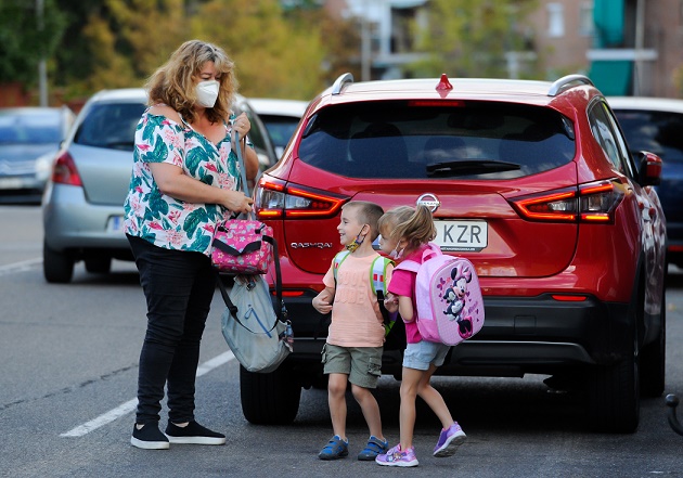 9月8日,一名家長(zhǎng)在西班牙馬德里送孩子上學(xué)。