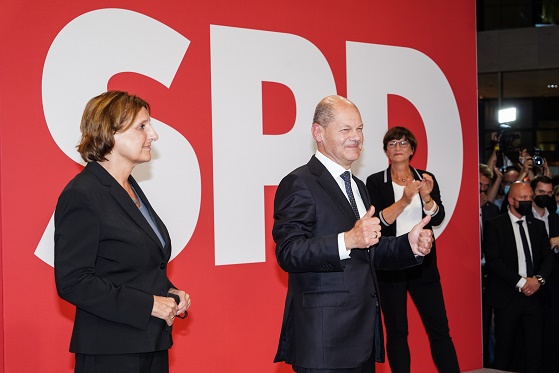 9月26日,在德國首都柏林的德國社會民主黨(社民黨)總部,社民黨總理候選人肖爾茨(中)向支持者致意。