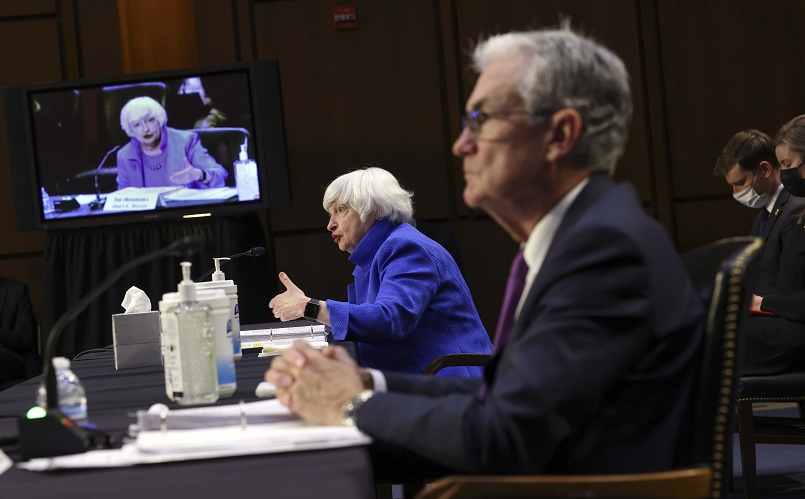 9月28日,美國財政部長耶倫(左一)在華盛頓出席國會參議院銀行、住房和城市事務(wù)委員會聽證會。
