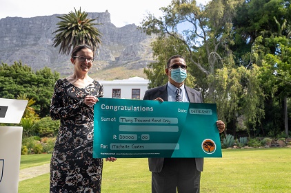 12月6日,在南非立法首都開普敦,南非西開普省負(fù)責(zé)農(nóng)業(yè)的官員伊萬·邁爾(右)在白蘭地創(chuàng)意比賽頒獎(jiǎng)活動(dòng)中為獲勝者頒獎(jiǎng)。
