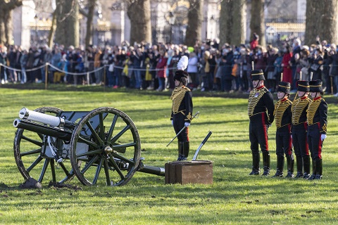 2月7日,英國士兵在倫敦白金漢宮旁的格林公園鳴放禮炮,慶祝女王伊麗莎白二世登基70周年。