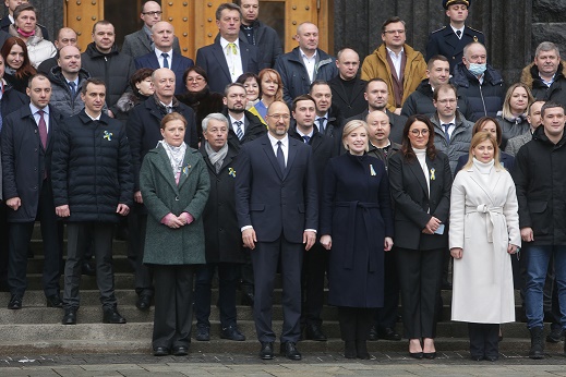 2月16日,在烏克蘭首都基輔,烏克蘭內(nèi)閣成員在烏政府辦公大樓前參加團(tuán)結(jié)日慶祝活動。