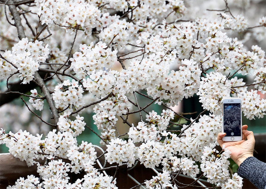 人民網(wǎng)訊 當(dāng)?shù)貢r間3月27日,日本東京河岸邊櫻花盛開,賞櫻人流如織。