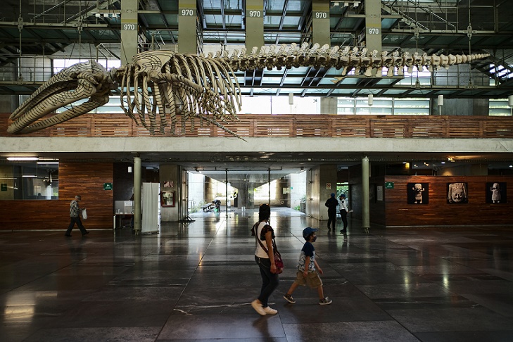 4月18日,在墨西哥首都墨西哥城的巴斯孔塞洛斯圖書館,人們走過館內(nèi)的灰鯨骨骼。