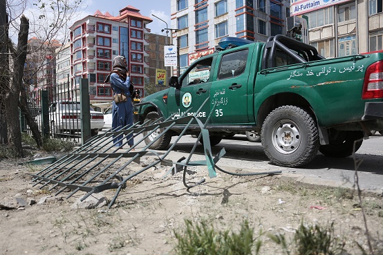 4月20日,警車停在阿富汗喀布爾的一起爆炸事件現(xiàn)場。