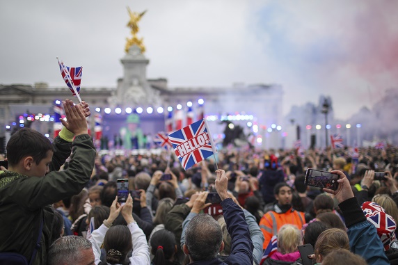 6月5日,在英國(guó)倫敦,人們?cè)诨ㄜ?chē)游行結(jié)束后聚集在白金漢宮前。