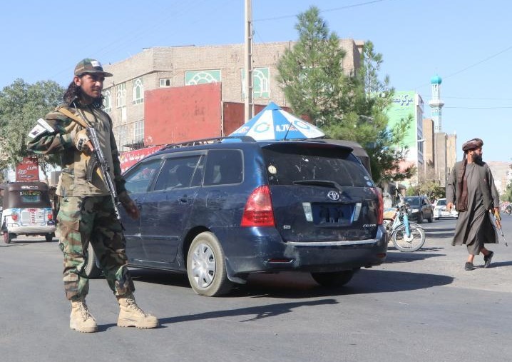 9月2日,在阿富汗赫拉特省發(fā)生爆炸的清真寺附近,安全人員設卡檢查。