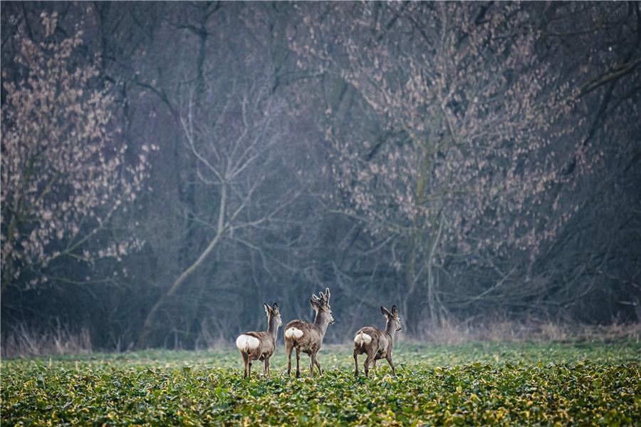 當?shù)貢r間2023年3月19日,波蘭托波諾村,3只歐洲狍在田間漫步。