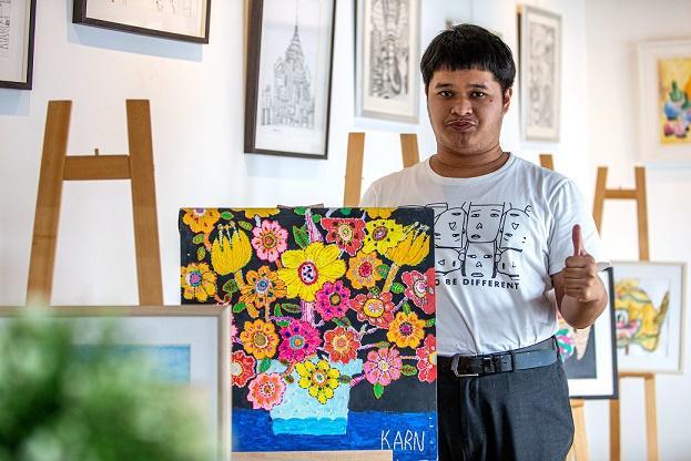 圖為4月2日,在位于曼谷的泰國孤獨癥職業(yè)中心,一名孤獨癥患者展示自己的繪畫作品。新華社記者 王騰 攝