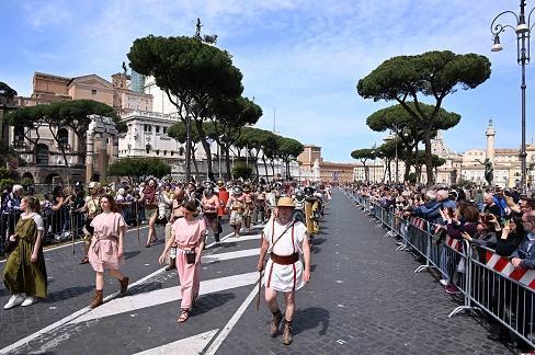 4月23日,人們穿戴古羅馬時(shí)期服飾,圍繞羅馬大競(jìng)技場(chǎng)、威尼斯廣場(chǎng)和斗獸場(chǎng)等景點(diǎn)進(jìn)行建城2776年慶祝游行。相傳羅馬建城日為公元前753年4月21日。