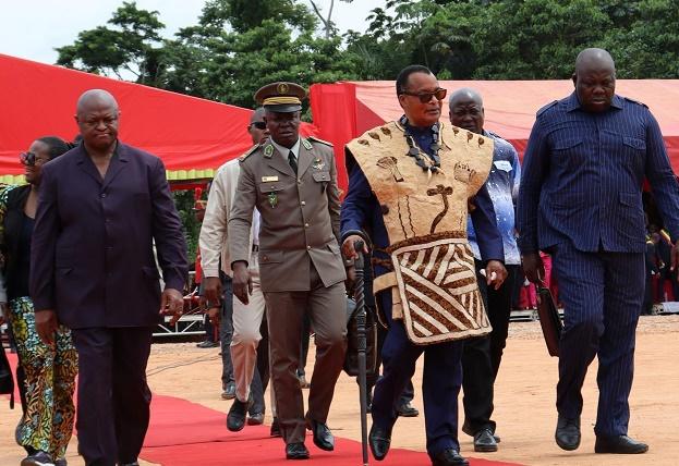 5月20日,在剛果(布)桑加省首府韋索市,剛果(布)總統(tǒng)薩蘇(前排中)出席韋索-博科拉道路及桑加大橋項(xiàng)目開工典禮。新華社發(fā)(中國路橋公司供圖)