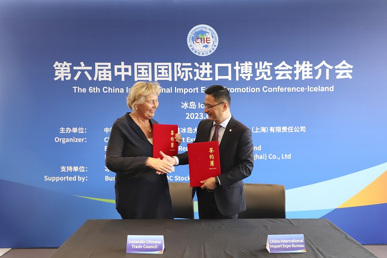 16日,在冰島雷克雅未克,冰中貿(mào)促會(huì)主席約尼娜·比亞特馬斯與中國(guó)國(guó)際進(jìn)口博覽局簽署合作備忘錄。新華社記者 陳靜 攝