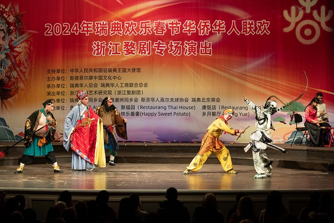 2月2日,瑞典斯德哥爾摩中國(guó)文化中心在斯德哥爾摩舉辦活動(dòng),通過(guò)美食、年畫(huà)、彩燈、舞龍和婺劇等多種形式,讓當(dāng)?shù)孛癖姾腿A僑華人享受了一場(chǎng)“歡樂(lè)春節(jié)”的文化大餐。這是演員在活動(dòng)中表演婺劇。新華社發(fā)(魏學(xué)超攝)