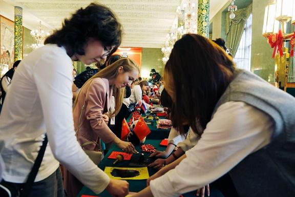 中俄兩國學生攜手奉獻了一場精彩的中國文化展演。民樂合奏《云宮迅音》、短劇《西游記之三打白骨精》、詩朗誦《沁園春?雪》、武術(shù)《武魂》和歌曲《嘻唰唰》《夢想從心開始》以及精彩互動,充分展現(xiàn)了同學們中文學習成果和對中國文化的理解。書法、剪紙、雕版印刷、民族服飾等15個中華文化體驗展臺,吸引同學們紛紛駐足。烤鴨、肉夾饃等中國小吃讓來賓體驗到中國飲食文化的豐富多彩。