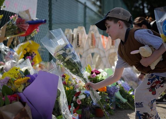 4月27日,在加拿大溫哥華駕車(chē)撞人事件發(fā)生地附近,一名男孩擺放鮮花悼念遇難者。新華社發(fā)(梁森攝)