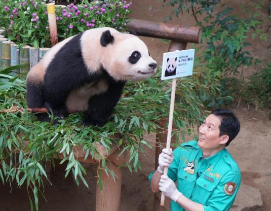 7月7日,在韓國(guó)京畿道龍仁市愛(ài)寶樂(lè)園,大熊貓“睿寶”與飼養(yǎng)員姜哲遠(yuǎn)互動(dòng)。新華社發(fā)(孫一然攝)