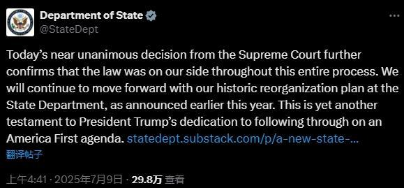美國國務(wù)院當天在社交媒體上發(fā)文說:“我們將繼續(xù)推進國務(wù)院的歷史性重組工作。”