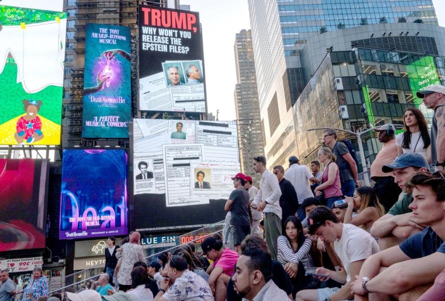 圖為當?shù)貢r間7月23日,美國紐約時報廣場廣告牌呼吁公開愛潑斯坦案所有文件。 CFP供圖