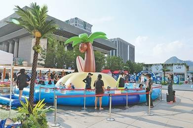 家長和孩子們在“2025首爾夏季海灘”活動現(xiàn)場的小型游泳池里消暑。人民日報記者 莽九晨攝