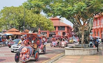 馬來西亞馬六甲古城的大街上,五彩繽紛的三輪車載著游客駛過。人民日報記者 章念生攝