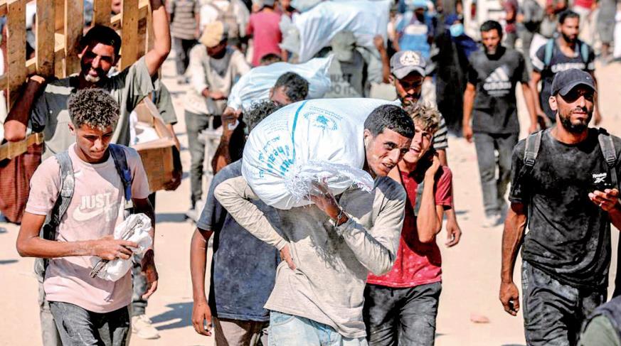8月5日,在加沙地帶拜特拉希耶,人們搬運援助物資。 新華社發(fā) 里澤克·阿卜杜勒賈瓦德 攝