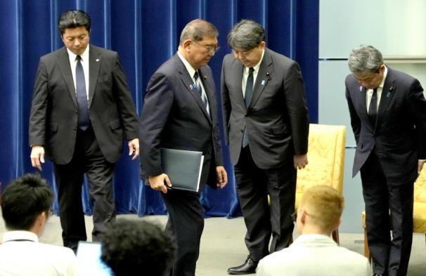 圖為當(dāng)?shù)貢r(shí)間2025年9月7日,日本首相石破茂(左二)在首相官邸舉行新聞發(fā)布會(huì)后離開。 CFP供圖