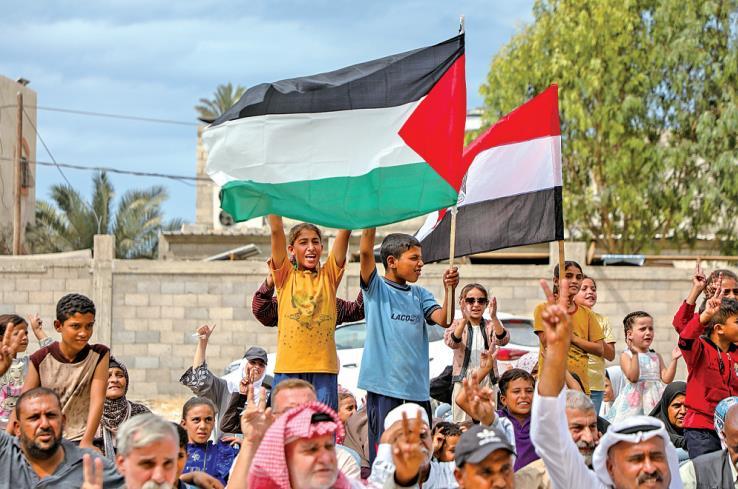 10月9日,在加沙地帶中部代爾拜拉赫,巴勒斯坦民眾在獲悉加沙?;饏f(xié)議的消息后慶祝。 新華社發(fā)(里澤克·阿卜杜勒賈瓦德攝)