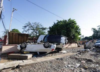 10月12日,在墨西哥韋拉克魯斯州波薩里卡,被洪水沖毀的車輛疊落在路邊。華社發(fā)(弗朗西斯科·卡涅多攝)