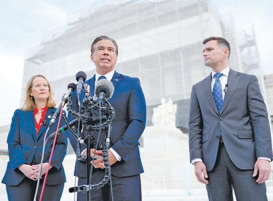 當(dāng)?shù)貢r(shí)間11月5日,美國(guó)華盛頓特區(qū),美最高法院就政府關(guān)稅政策合法性舉行聽證會(huì)后,加州司法部長(zhǎng)羅伯·邦塔(中)等人在最高法院外向媒體發(fā)表講話。 CFP供圖