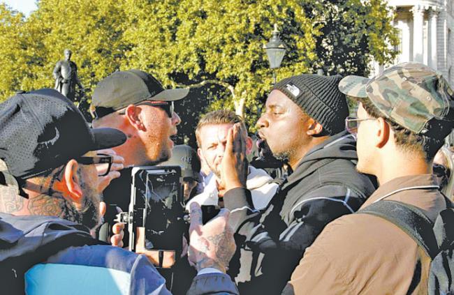圖為在英國首都倫敦,對移民持不同觀點的人們在抗議活動現(xiàn)場爭辯。 新華社記者 高文成 攝