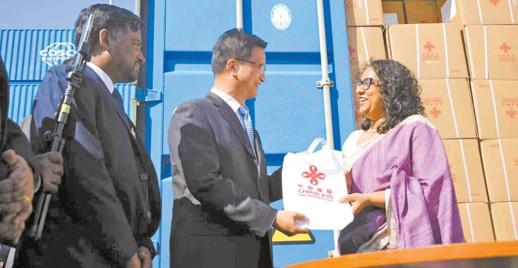 圖為戚振宏大使和斯里蘭卡總理阿馬拉蘇里亞在捐贈(zèng)儀式現(xiàn)場。