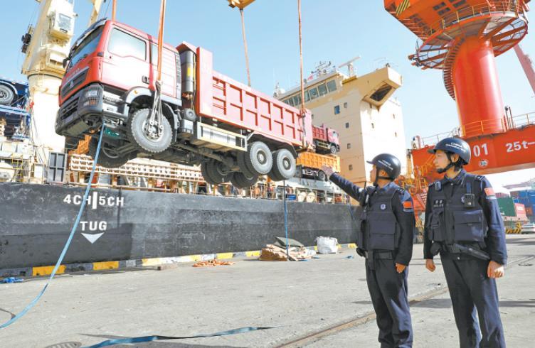 2025年11月28日,江蘇省張家港港務(wù)集團有限公司碼頭一片忙碌,貨輪停在泊位上有序裝載385輛“中國制造”工程車,準備駛往“一帶一路”共建國家肯尼亞。 CFP供圖