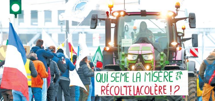 圖為當(dāng)?shù)貢r(shí)間1月20日,法國斯特拉斯堡,來自歐洲各地的約5400名農(nóng)民和700輛拖拉機(jī)在歐洲議會(huì)前示威,抗議簽署歐盟—南共市自貿(mào)協(xié)定。 CFP供圖