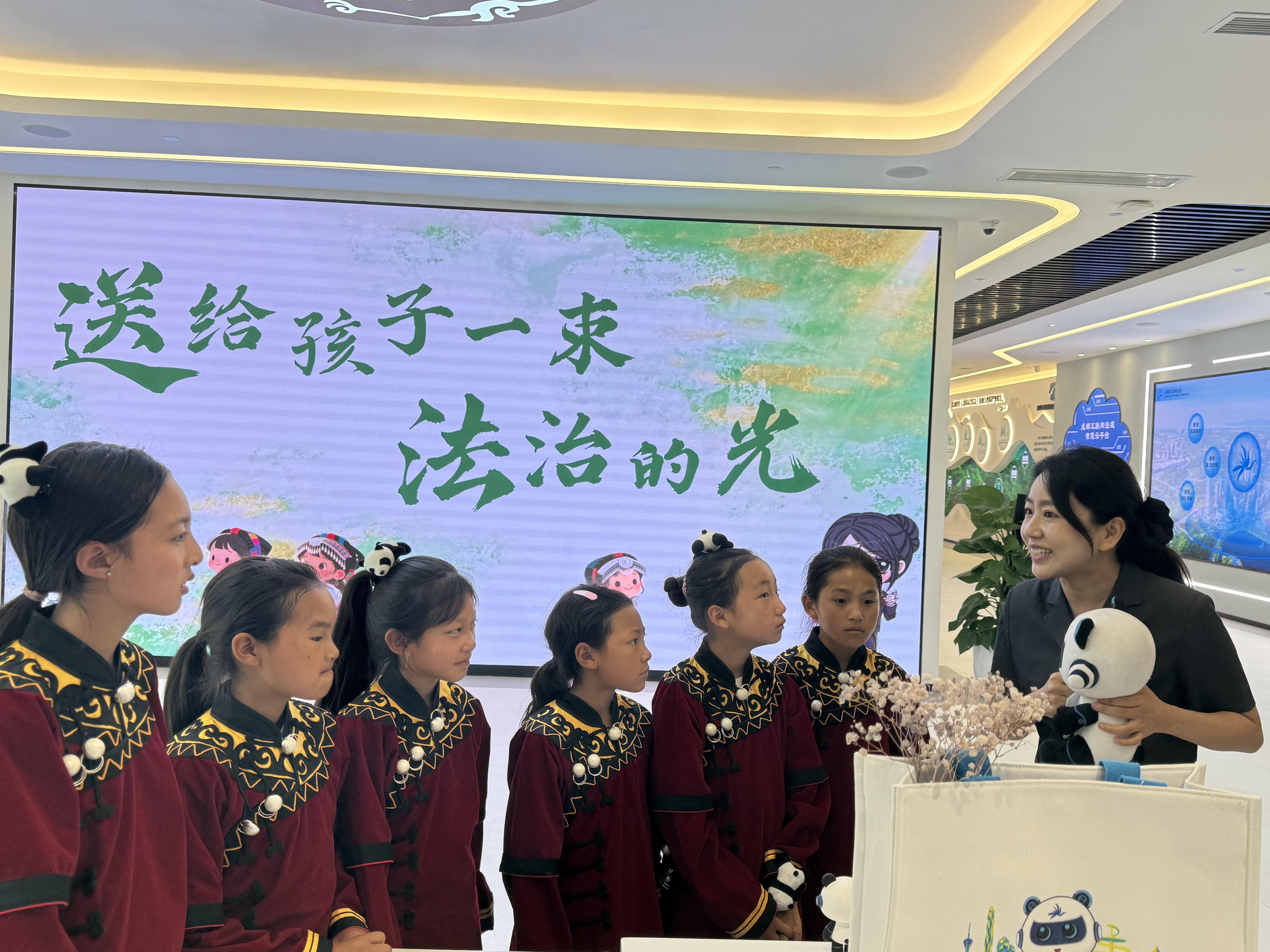 在四川大熊貓國家公園生態(tài)法庭的普法互動區(qū),妞妞們表現(xiàn)出對野生動物保護法律知識很感興趣,丁倩詳細介紹了四川境內(nèi)的珍稀野生動植物保護知識,大熊貓國家公園、攀枝花蘇鐵國家級自然保護區(qū)、臥龍自然保護區(qū)等生態(tài)環(huán)境司法保護情況等。