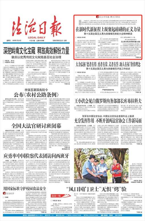 天地有正氣,義勇古今頌。7月21日,第十五屆全國(guó)見(jiàn)義勇為英雄模范表彰大會(huì)在北京召開(kāi),隆重表彰60個(gè)見(jiàn)義勇為英雄模范個(gè)人和群體。本報(bào)自今天起開(kāi)設(shè)“見(jiàn)義中華魂 勇為萬(wàn)家安”專欄,刊發(fā)一系列相關(guān)報(bào)道,進(jìn)一步推動(dòng)見(jiàn)義勇為工作高質(zhì)量發(fā)展,在全社會(huì)營(yíng)造見(jiàn)義勇為氛圍,為助力建設(shè)更高水平的平安中國(guó)、法治中國(guó)匯聚更多的正能量。