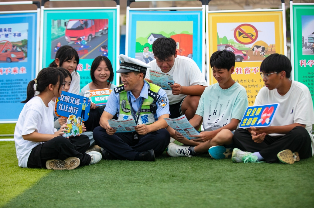 圖為8月28日,民警走進(jìn)橫峰縣職業(yè)中學(xué)軍訓(xùn)現(xiàn)場向同學(xué)們宣傳交通安全法律法規(guī)。