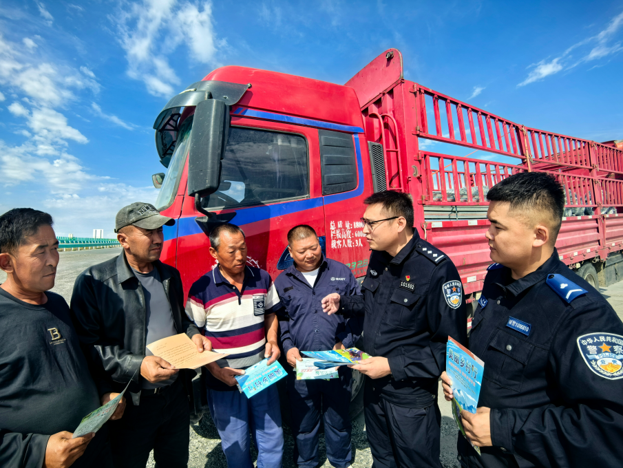 圖為9月10日,廟爾溝派出所民輔警開(kāi)展規(guī)范裝載貨物、拒絕疲勞駕駛等交通安全知識(shí)宣傳活動(dòng)。