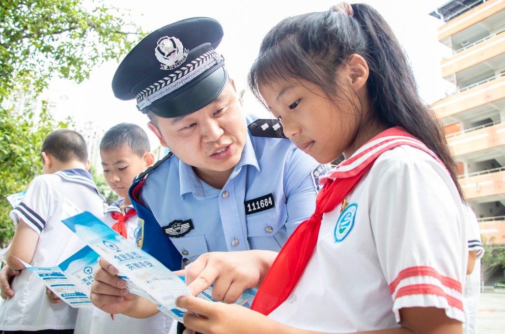 圖為9月12日,在重慶市巫山縣實(shí)驗(yàn)小學(xué)操場(chǎng),巫山站派出所民警向?qū)W生們普及法律知識(shí)。