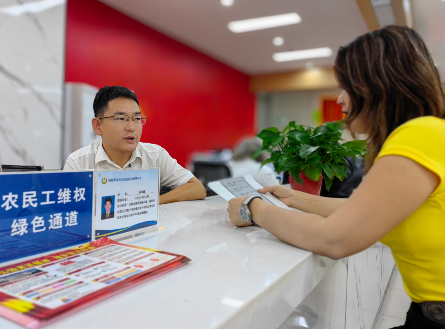 圖為9月21日,阿圖什市綜治中心“農(nóng)民工維權(quán)綠色通道”窗口工作人員正在接待來(lái)訪群眾。