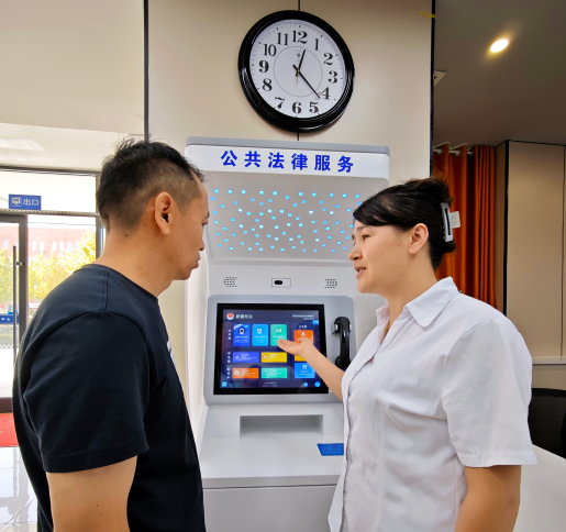 圖為9月21日,阿圖什市綜治中心工作人員向來(lái)訪群眾介紹公共法律服務(wù)自助服務(wù)系統(tǒng)功能。