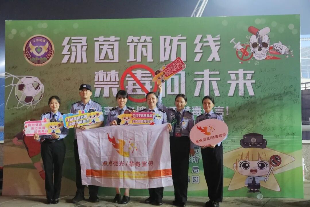 賽前球迷互動區(qū)里,江蘇省女子強制隔離戒毒所“點點微光”禁毒宣傳團隊積極行動,聯(lián)合鎮(zhèn)江市體育局、鎮(zhèn)江市文化廣電和旅游局、鎮(zhèn)江市文化廣電產(chǎn)業(yè)集團等單位,為鎮(zhèn)江、無錫球迷送上禁毒知識和禁毒文創(chuàng)?!包c點微光”禁毒宣傳吉祥物“星星”也驚喜現(xiàn)身,與球迷代表在禁毒宣誓墻上寫下禁毒承諾,共同喊出“鎮(zhèn)江無錫,共筑防線”的青春無毒誓言。