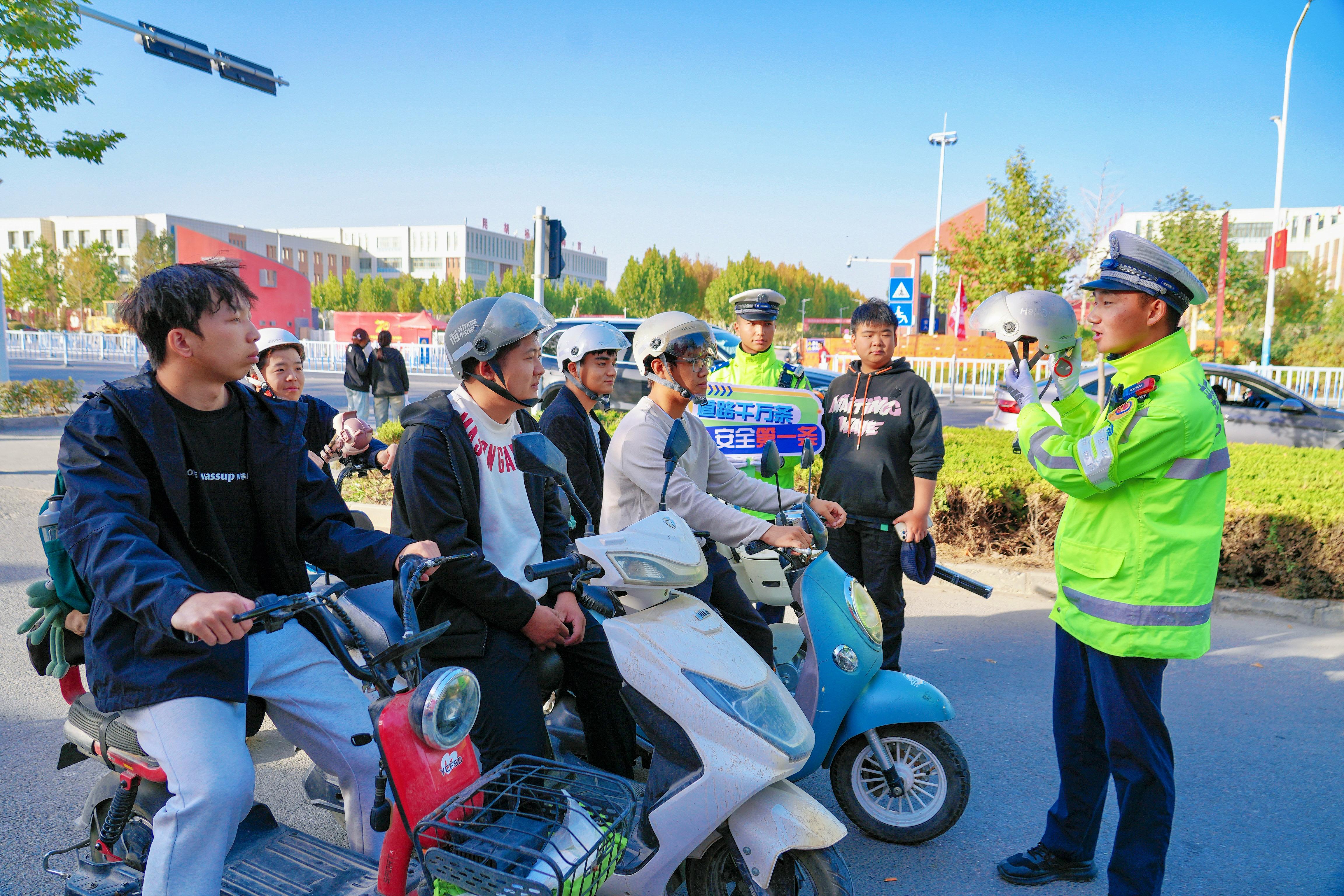 圖為10月16日,溫宿縣公安局交通管理大隊民警向新疆理工學院學生普及文明騎車相關知識,引導學生切勿逆向行駛。