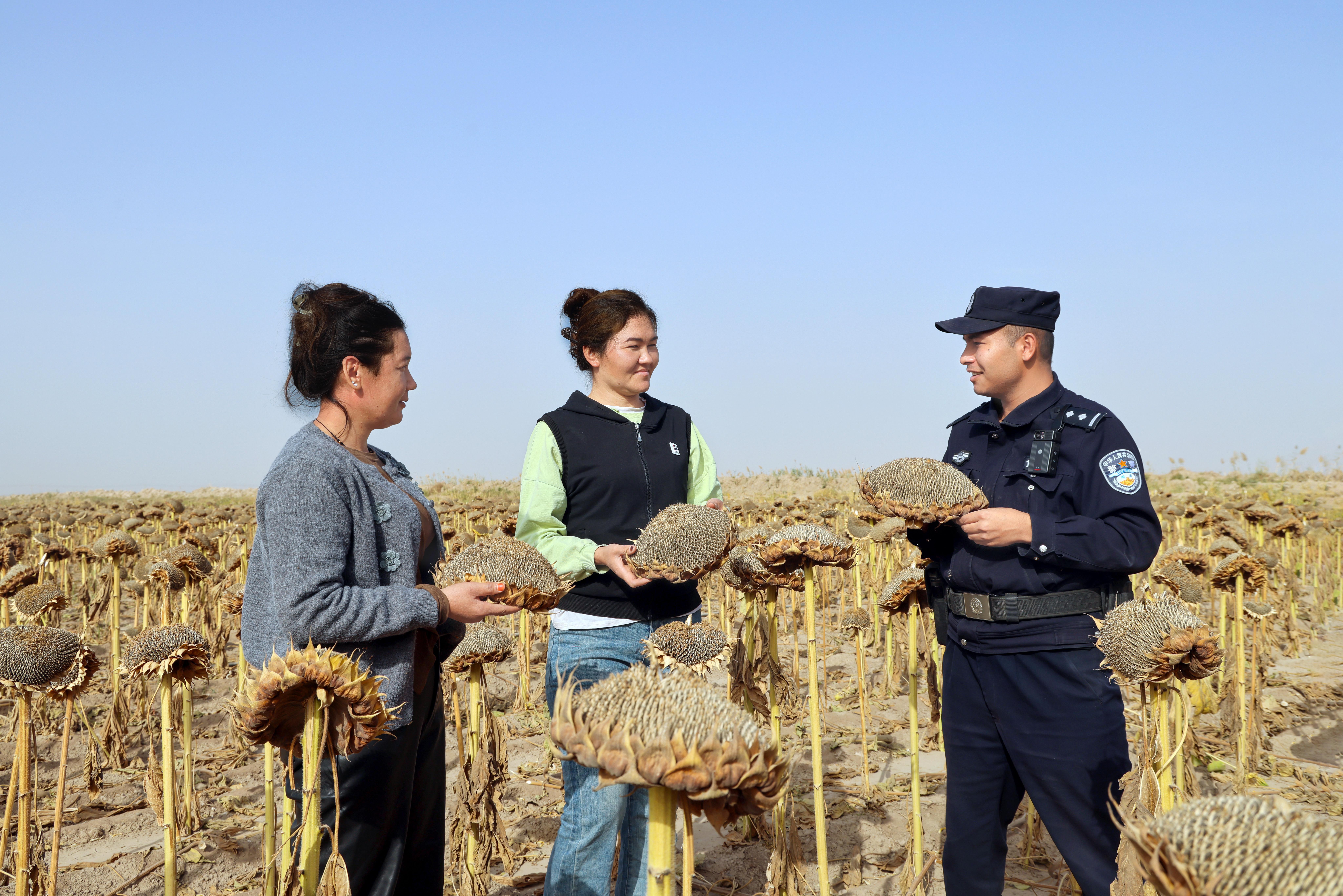 10月29日,新疆巴楚縣萬(wàn)畝食葵迎來(lái)采收高峰。在恰爾巴格鄉(xiāng)庫(kù)木加依村的田間地頭,連片的食葵垂下飽滿(mǎn)的花盤(pán),收割機(jī)的轟鳴聲與人們的歡笑聲此起彼伏,處處洋溢著豐收的喜悅。在這片金黃畫(huà)卷中,一群身著藏藍(lán)警服的身影格外醒目——巴楚縣公安局成立的“秋收服務(wù)隊(duì)”的民輔警正忙碌其間,他們不僅助力采收解民憂(yōu),更將反詐知識(shí)帶到生產(chǎn)一線(xiàn),實(shí)現(xiàn)“秋收+反詐”的雙贏局面。