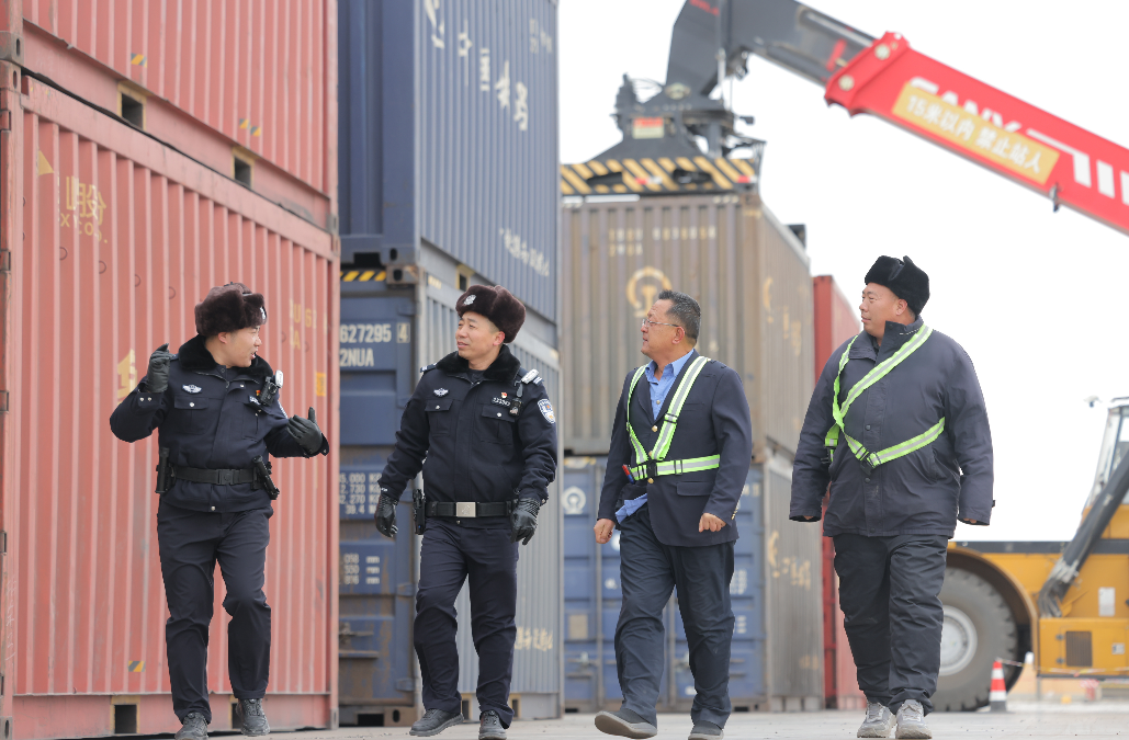 圖為烏魯木齊鐵路公安局庫爾勒公安處依吞布拉克站派出所民警到轄區(qū)貨場進行安全生產檢查。
